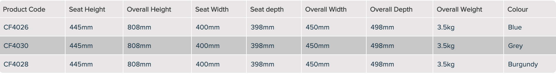 The Zlite folding chair range is compact, stylish and affordable. This makes it the perfect folding chair option for guests and students, at those important school events. The zlite brand of folding exam and event chairs are second to none. Launched to satisfy the most demanding markets. Blue, burgundy & charcoal colours available, Grey steel frame for durability, Double riveted cross-braces for greater strength, Chair weighs just 3kg, Protective feet buffers, Fold flat frame ensures compact stacking and storage.